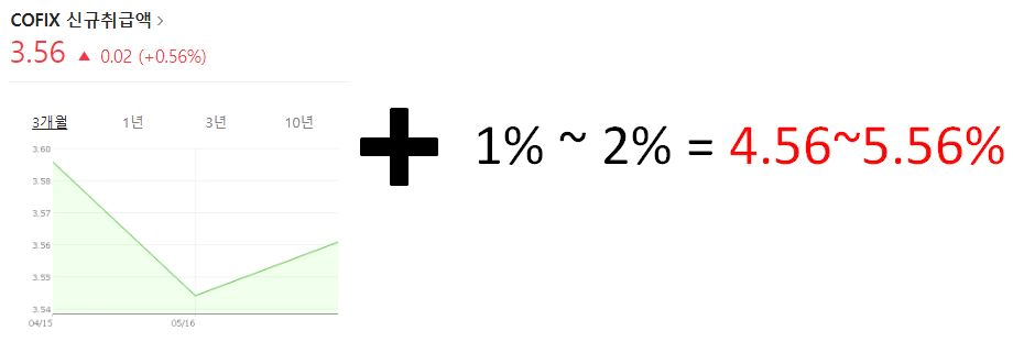 - 아직 중도금이 실행되지 않아 정확한 금리를 모를 경우, 일반적으로 매달 발표되는 신규 Cofix 취급액 금리에서 1%~2% 정도를 가산하면 대략적으로 예상이 가능합니다.